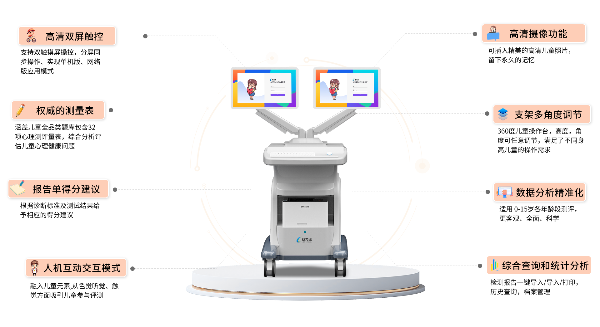 產(chǎn)品優(yōu)勢(shì):趣味界面、語(yǔ)音提示、快速分析、雙屏協(xié)同、報(bào)告打印