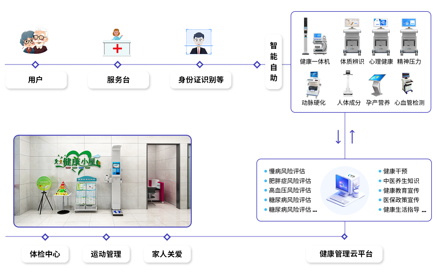 為用戶構建一個專業(yè)、安全且高效的健康管理體系,旨在實現人群的自助健康檢測、建立健康檔案,并提供健康預警等項目的篩查。這一體系是各種衛(wèi)生和健康管理機構在院外的終端服務,融合了自助健康監(jiān)測和專業(yè)醫(yī)療健康服務的功能。